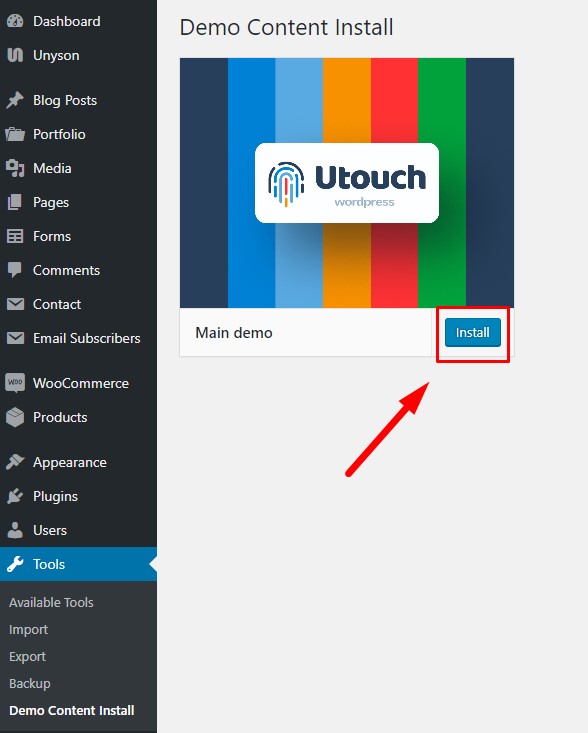 When installation process is finished, you're automatically redirected to the 'Demo Content Install' section. Click on the 'Install' button and wait a few moments.