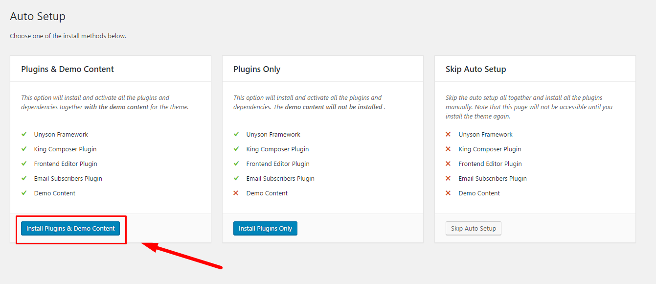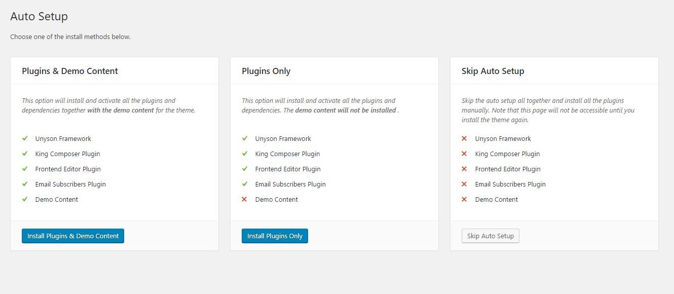 Upon theme installation and activation you are redirected to the Auto Setup page. You are offered three options: