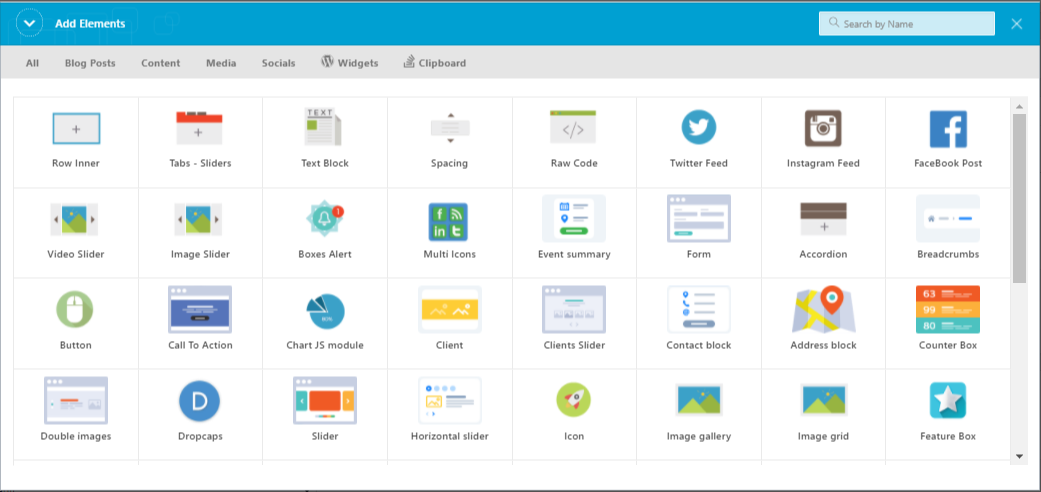 All KC elements are divided in tabs by functionality and have small thumbnails above titles to demonstrate their role in the theme.