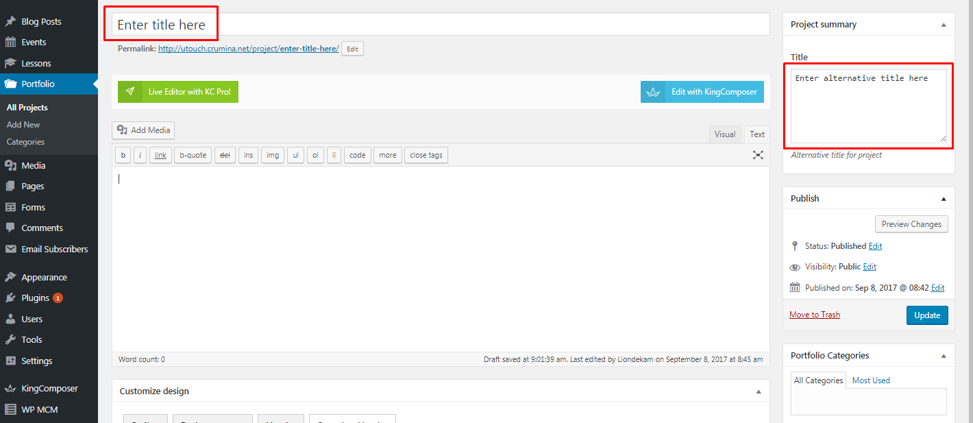 - Fill in Project summery title on the right - this title will be displayed on your portfolio archive pages or leave the field empty to show your project origonal title