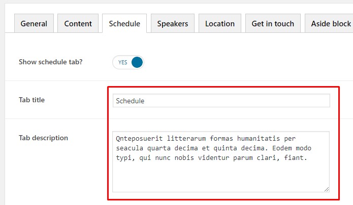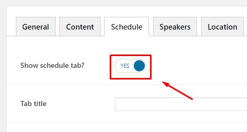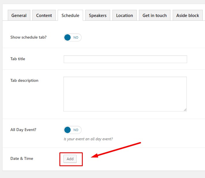 If you want to show "Schedule" tab on the events item page, toggle "Show Schedule tab" switcher to "On". If you don't want to show it, you can still enter date & time information below. It can be displayed in the stunning header section or on the global events page, if corresponding options are enabled.
