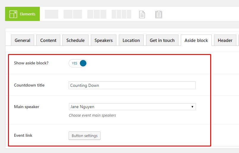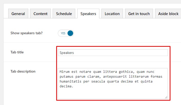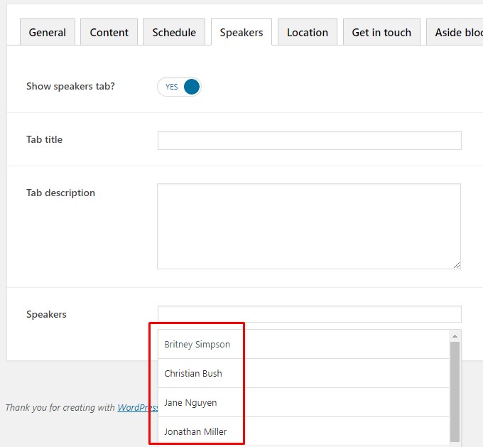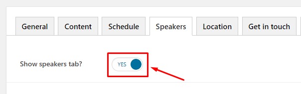 In order to activate the tab on the event item page, toggle "Show Speakers tab" to "On".