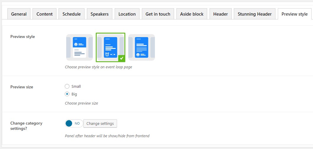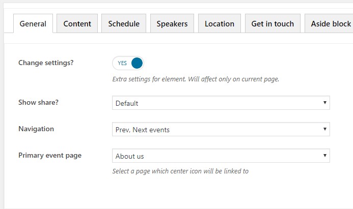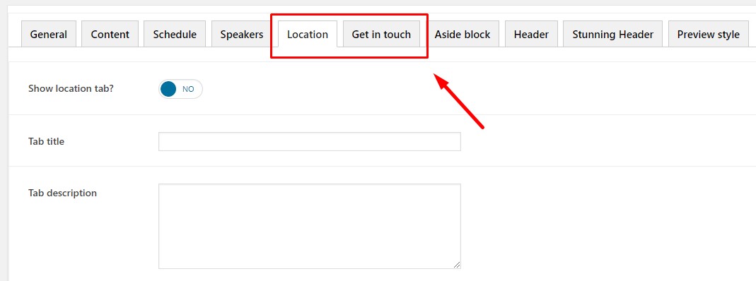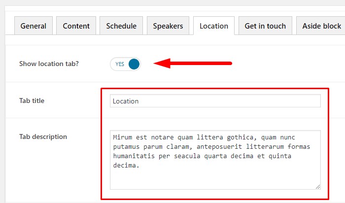 If you want to display "Location" tab on the event item page, toggle "Show location tab?" switcher to "On".