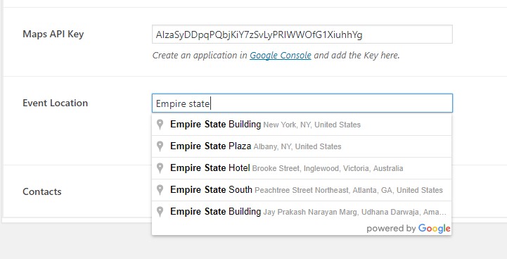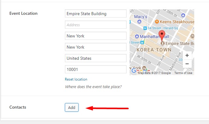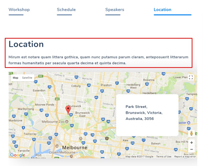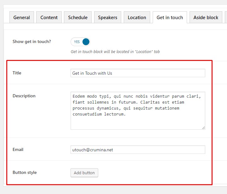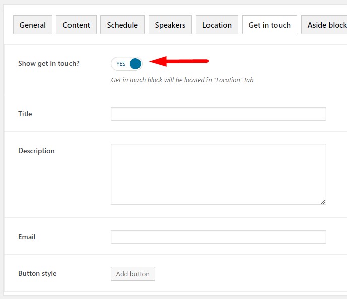 Under "Location" tab you can display Google map with an address, where the event will be held, and contact form. These elements are configured under "Location" and "Get on Touch" tabs in the event admin page.