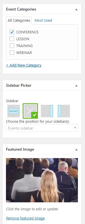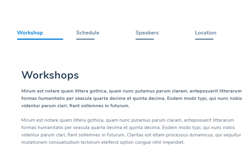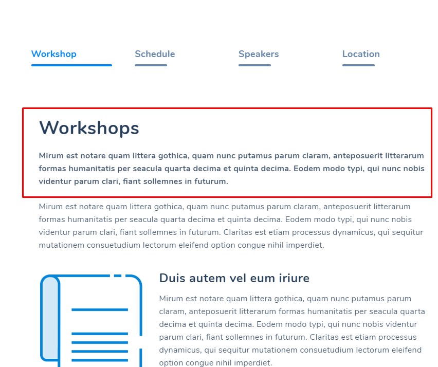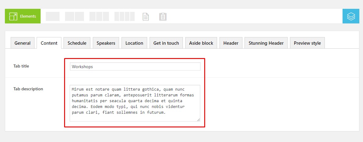 "Workshop" tab includes main description of the event. You can add content via the default WordPress editor or with help of the King Composer builder.