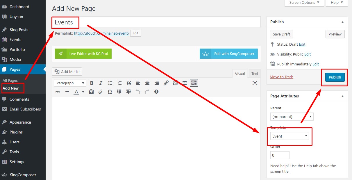 To create a global events page, go to Pages>Add new, select "Event" template and press Publish button.