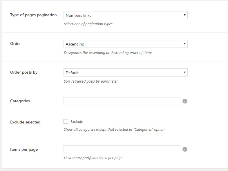 - Categories - choose certain categories or leave the field empty to show all categories on page.