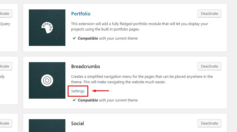 2. Find 'Breadcrumbs' extension and click on the Settings link in it.