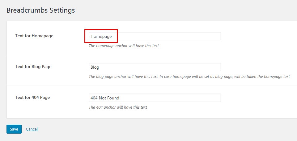 3. Type desired text in the 'Text for Homepage' field. And save changes.